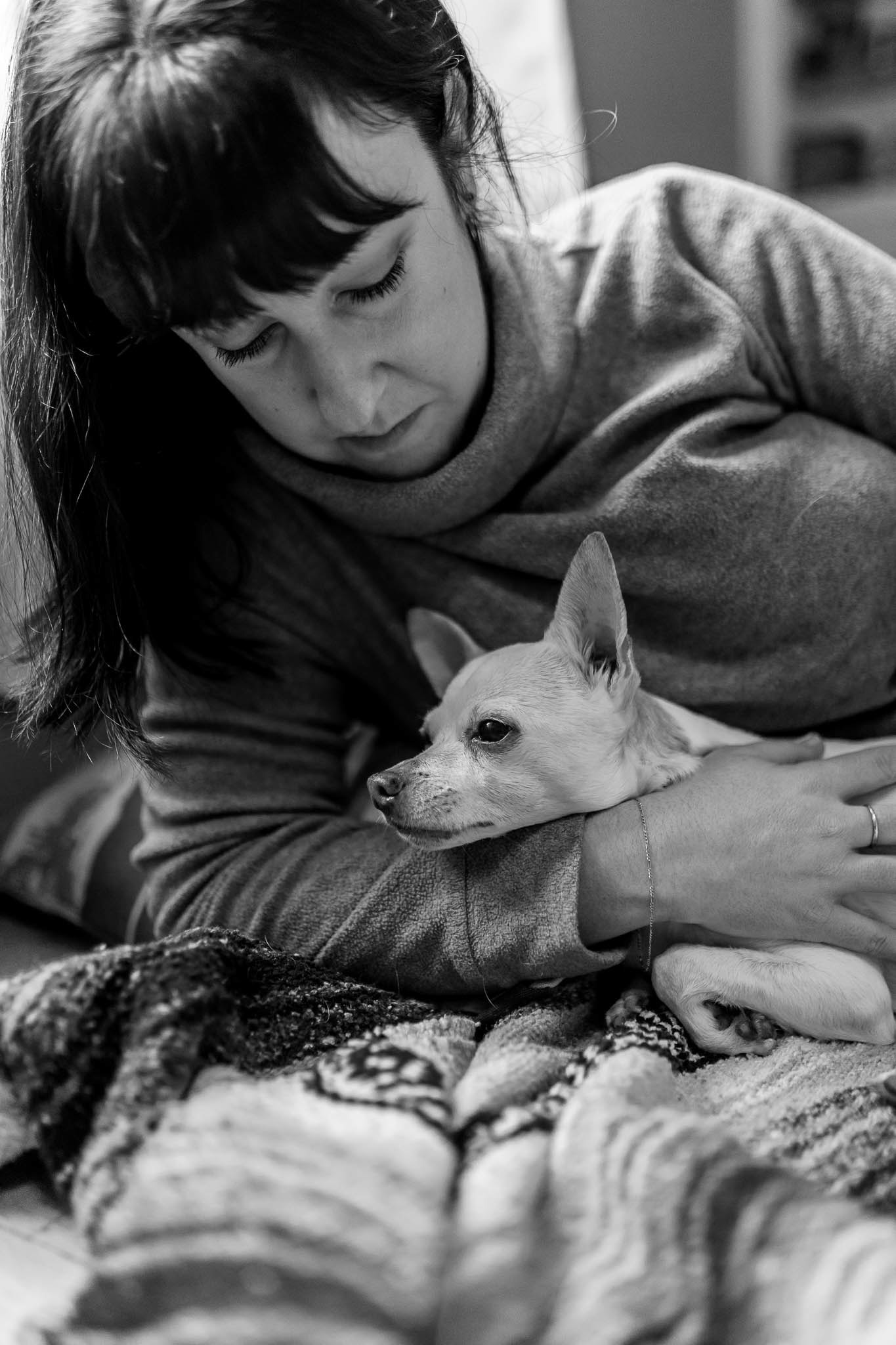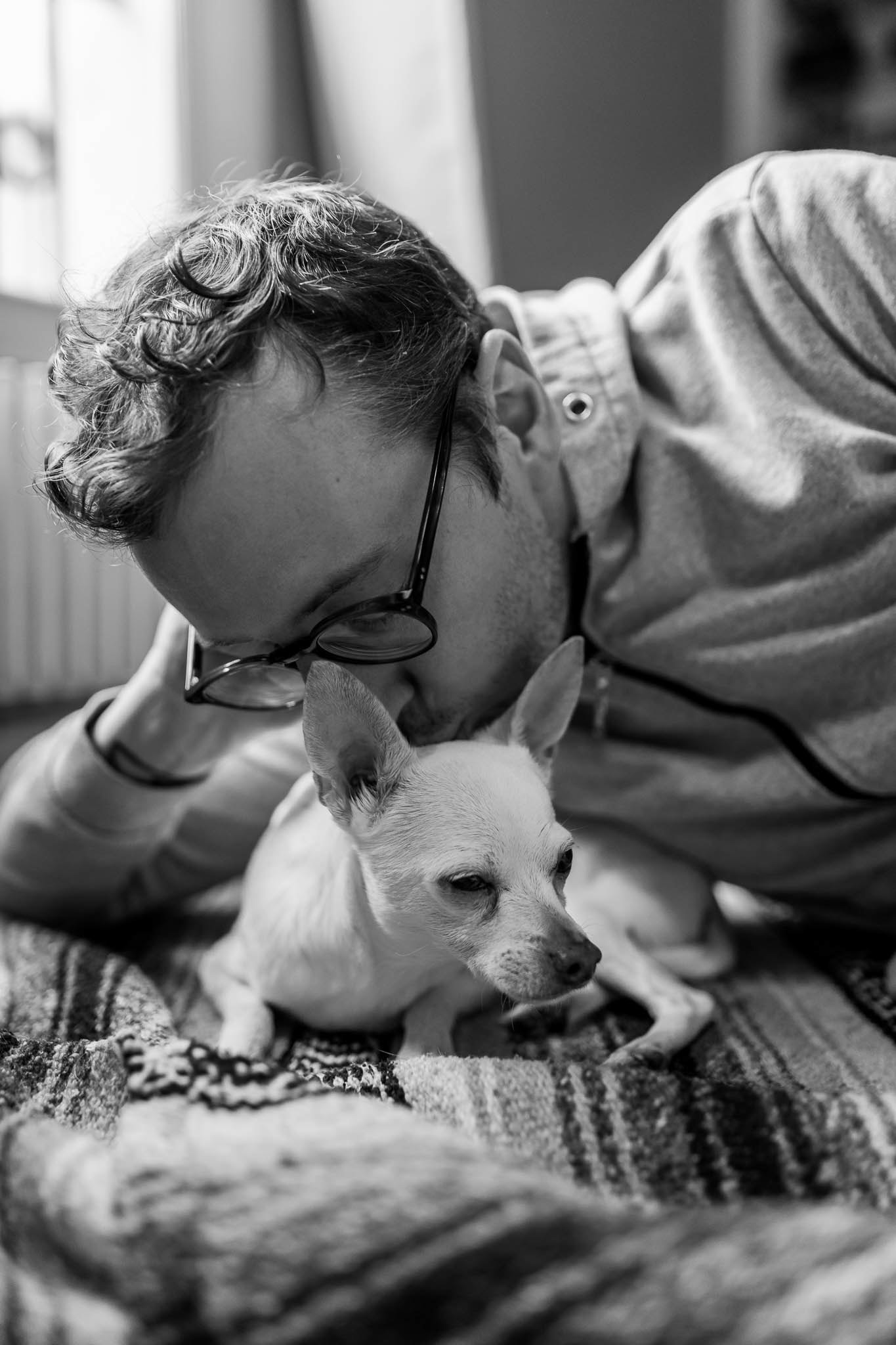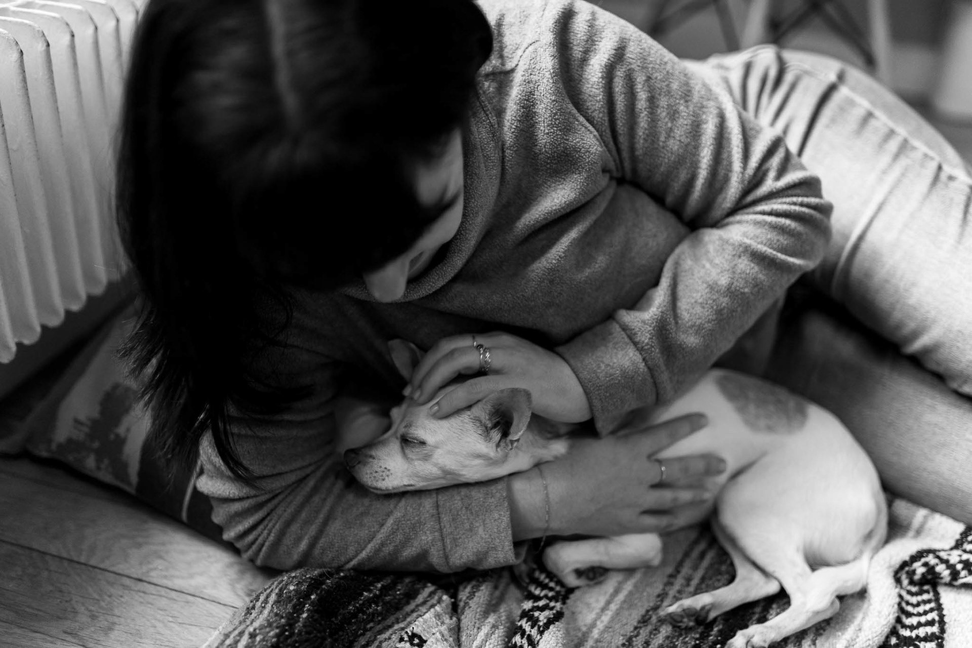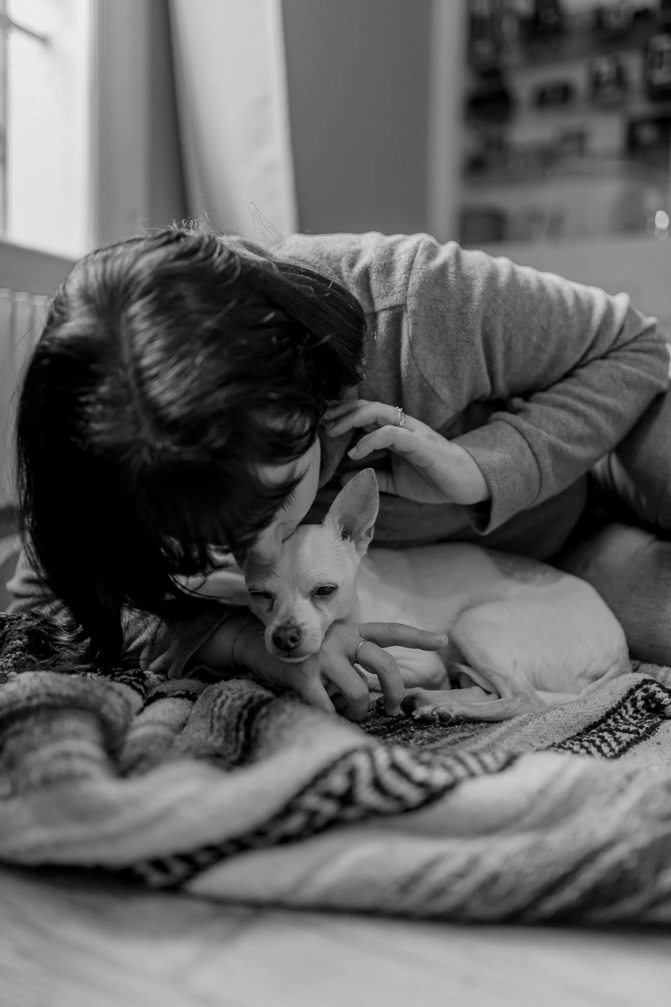 Hazel moved from the US to Paris with her parents a few years ago. Now, at 16 years old and living with dementia, her family wanted to treasure the last moments they could share with her in their Parisian home. During the session, Hazel was calm, surrounded by the love of those who have been by her side all her life. Between cuddles and tender looks, we captured what truly matters: the connection and the unconditional love that will live forever through these photographs.