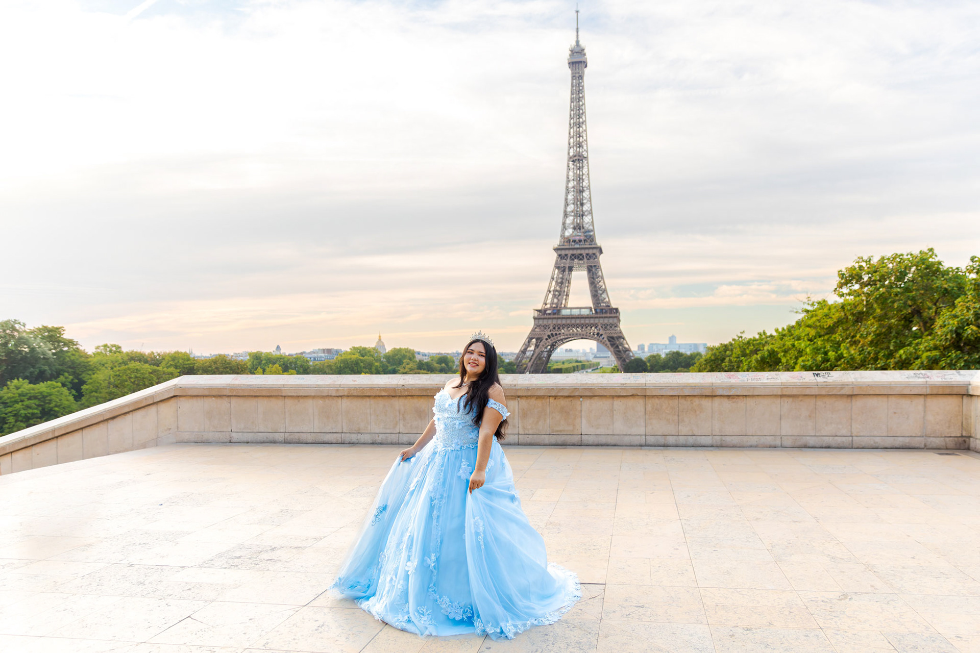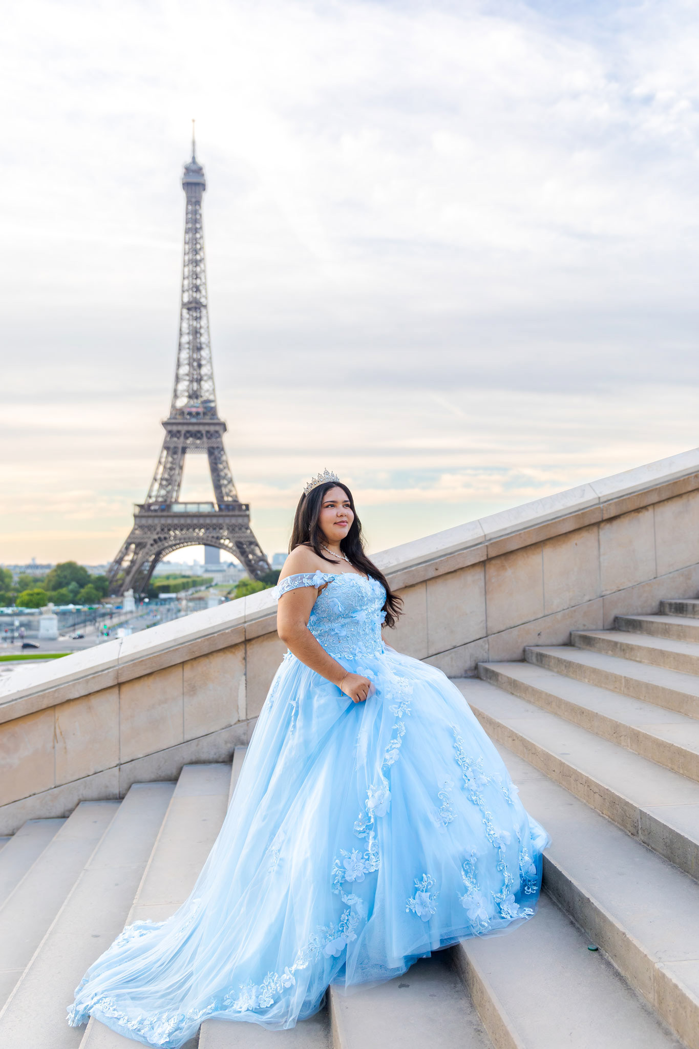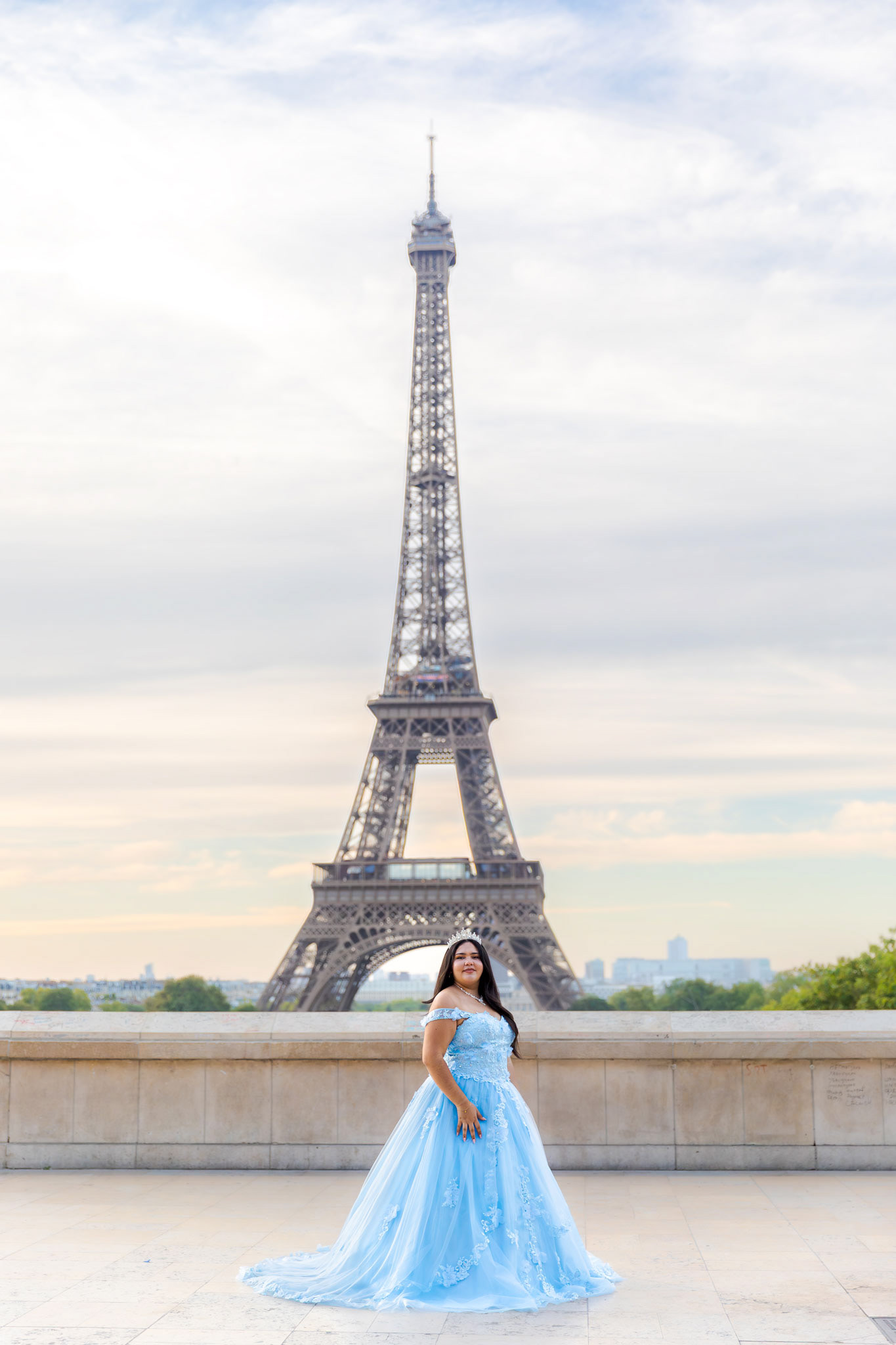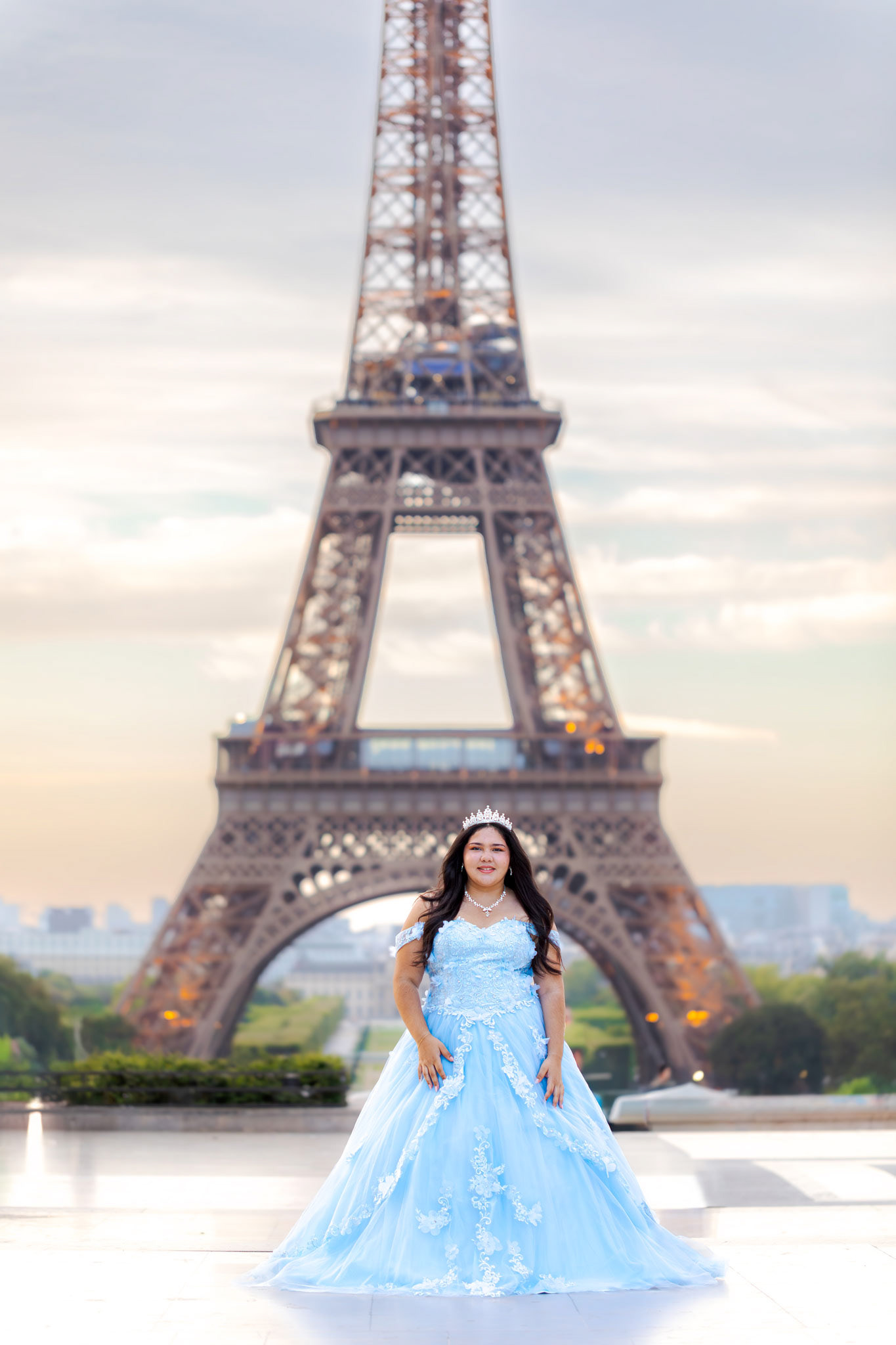 Kamila traveled all the way from Miami to Paris to fulfill her dream of a quinceañera photoshoot in the heart of the city. Wearing her beautiful, voluminous dress, she arrived at the Plaza de Trocadéro, the most iconic spot for photos with the Eiffel Tower in the background.