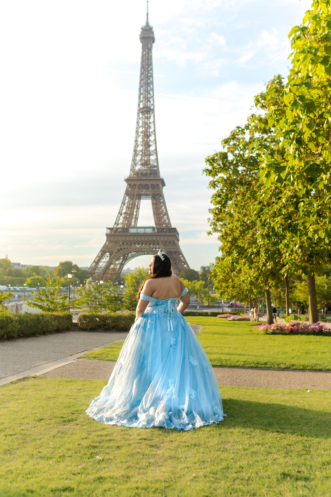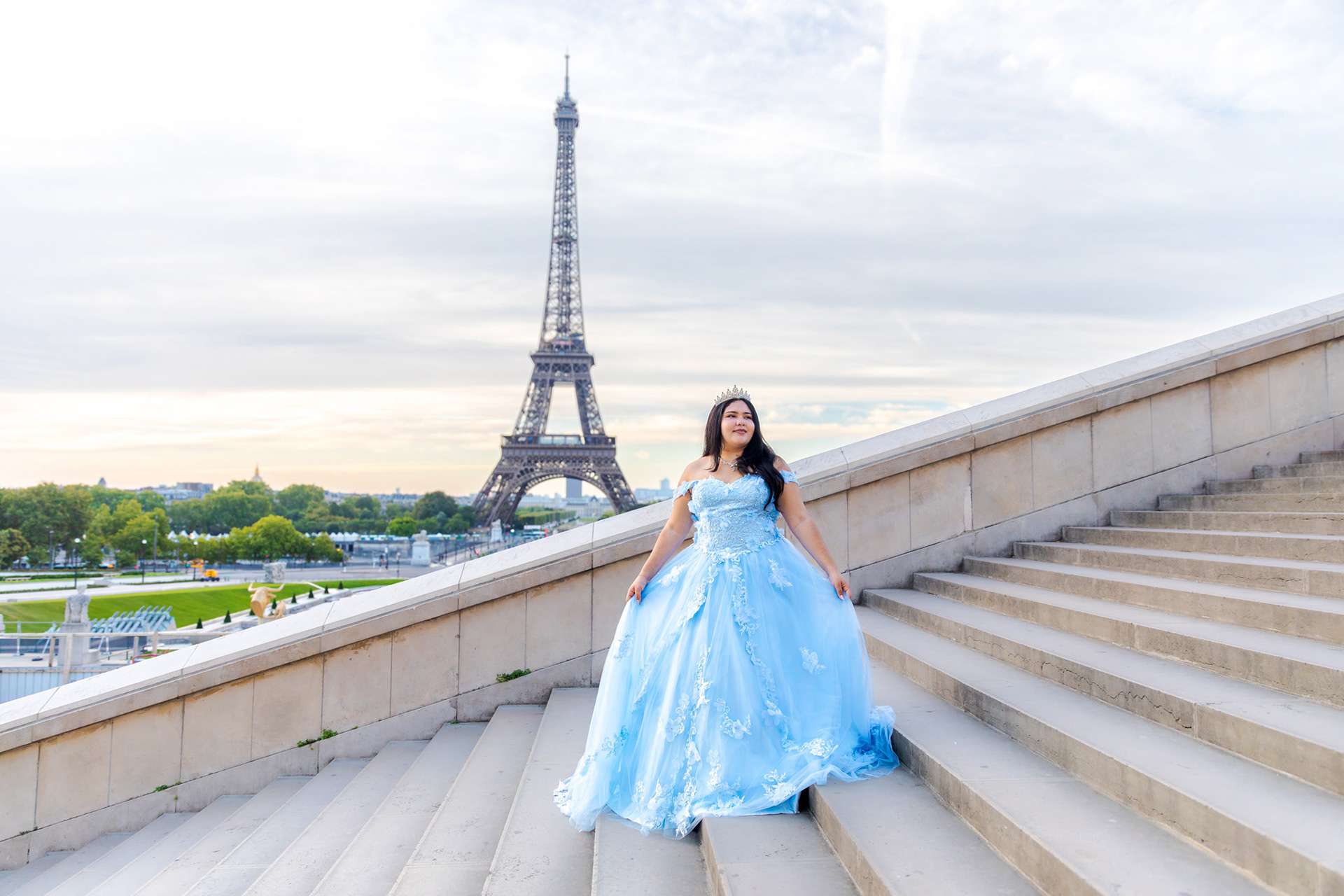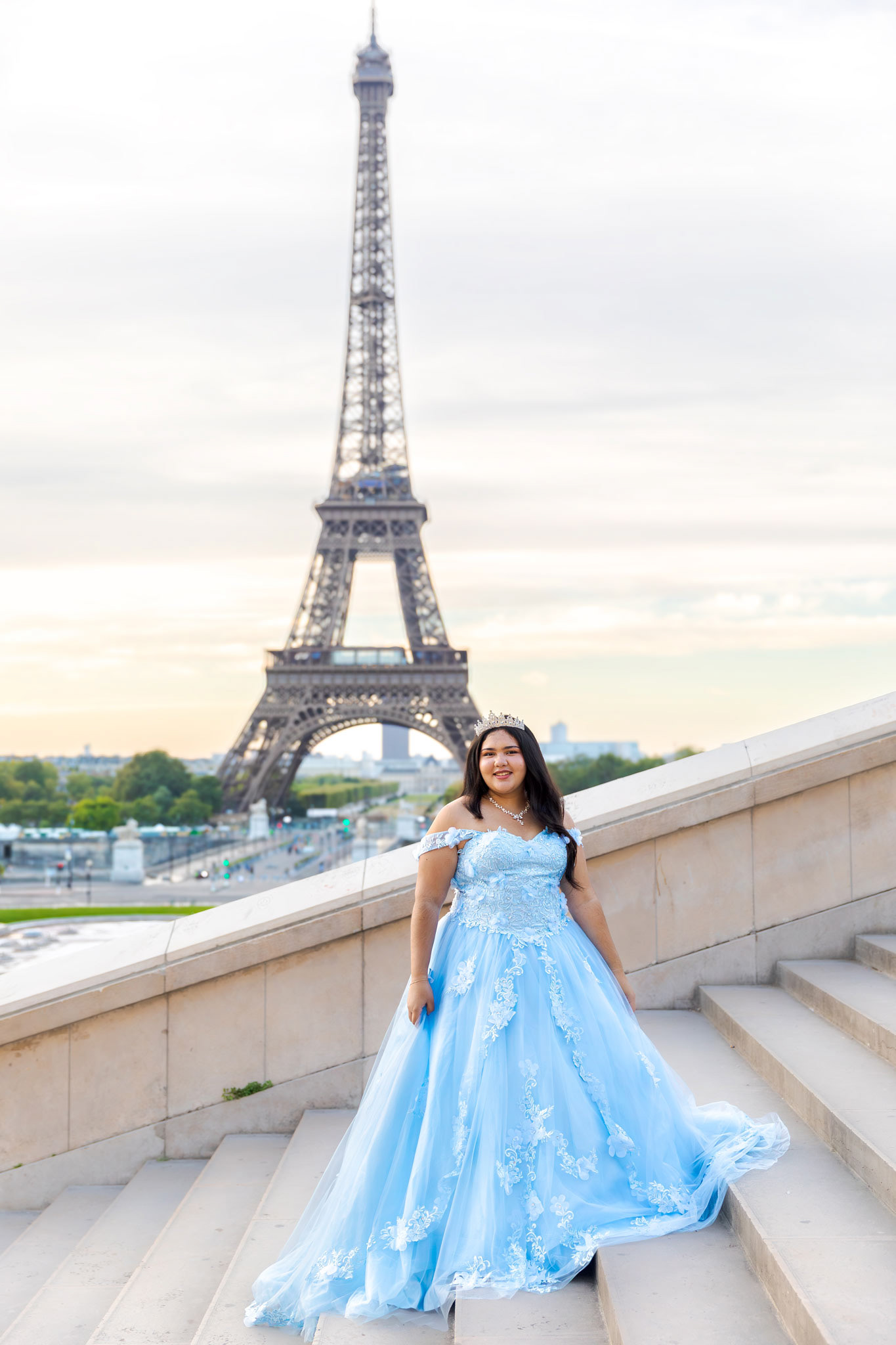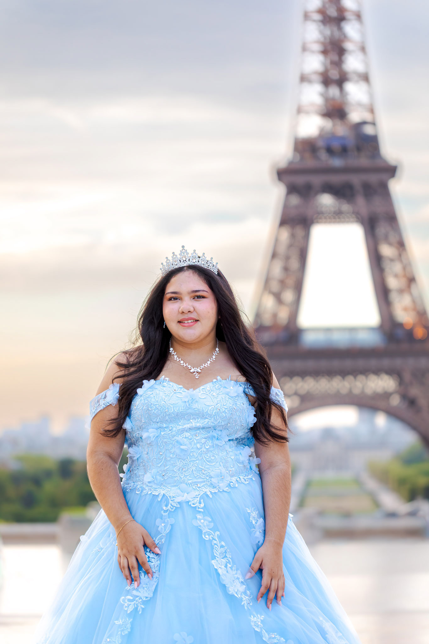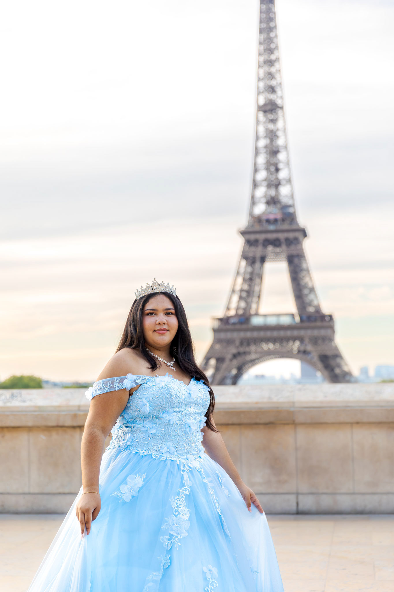 Kamila traveled all the way from Miami to Paris to fulfill her dream of a quinceañera photoshoot in the heart of the city. Wearing her beautiful, voluminous dress, she arrived at the Plaza de Trocadéro, the most iconic spot for photos with the Eiffel Tower in the background.