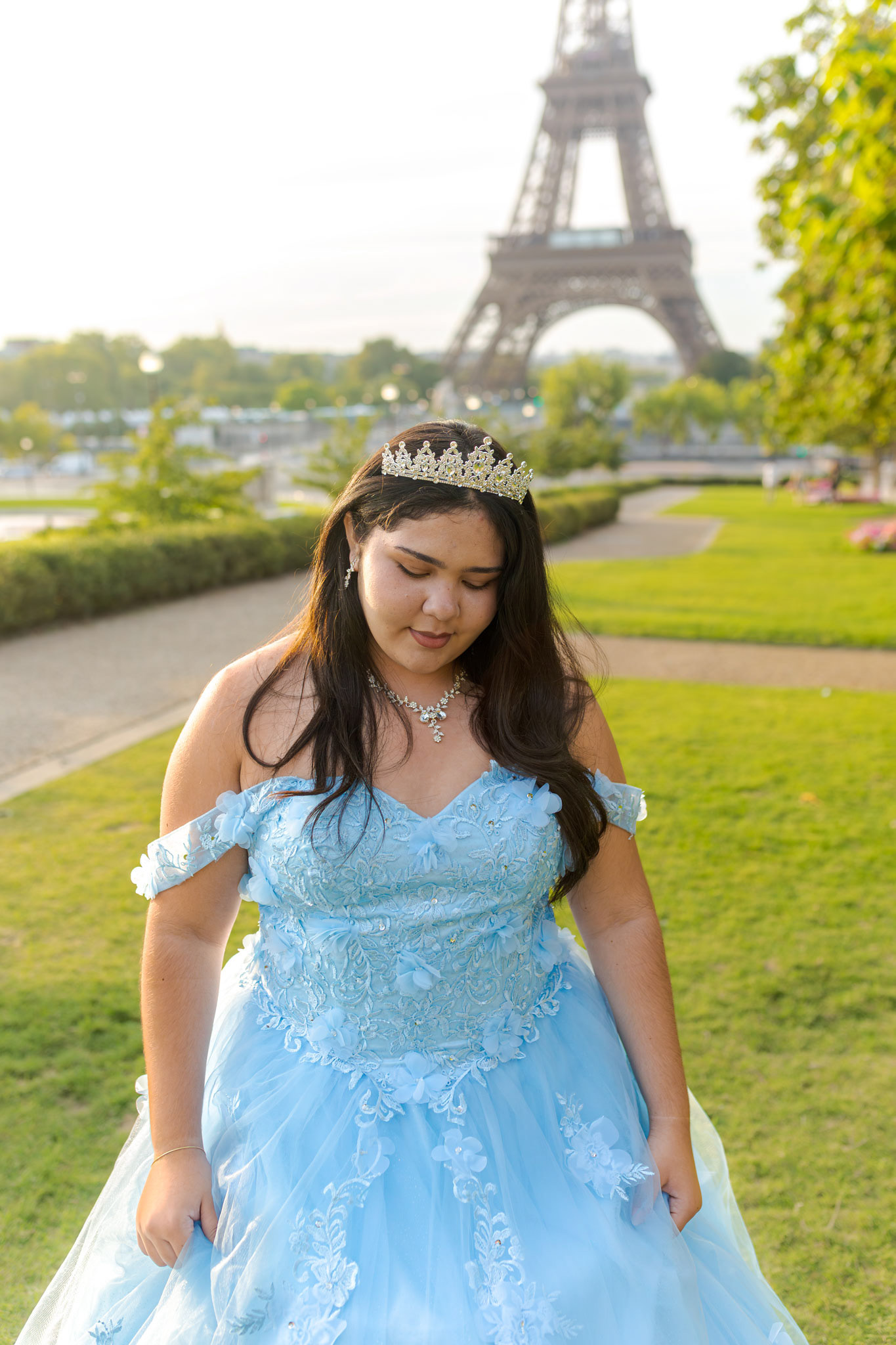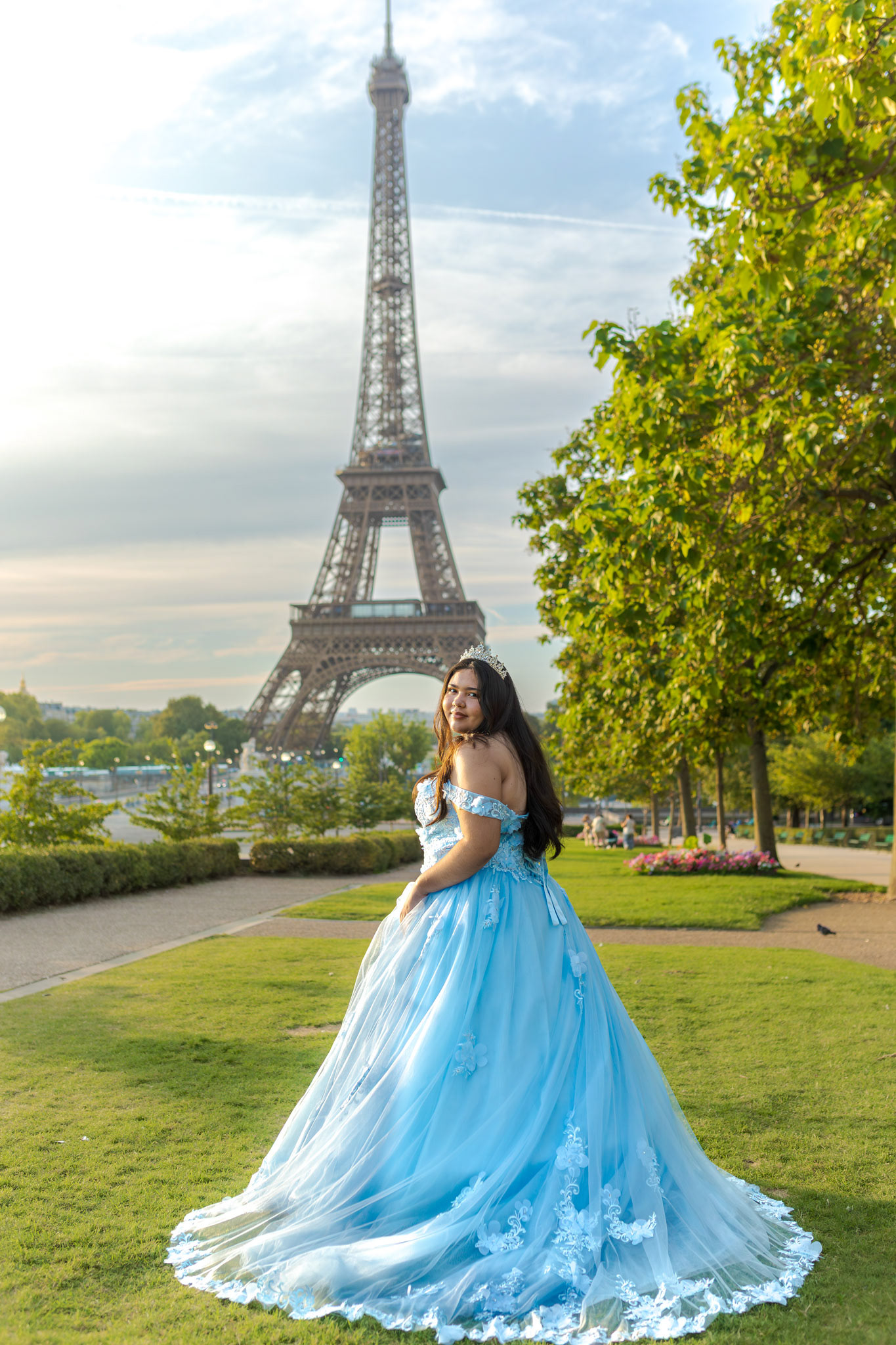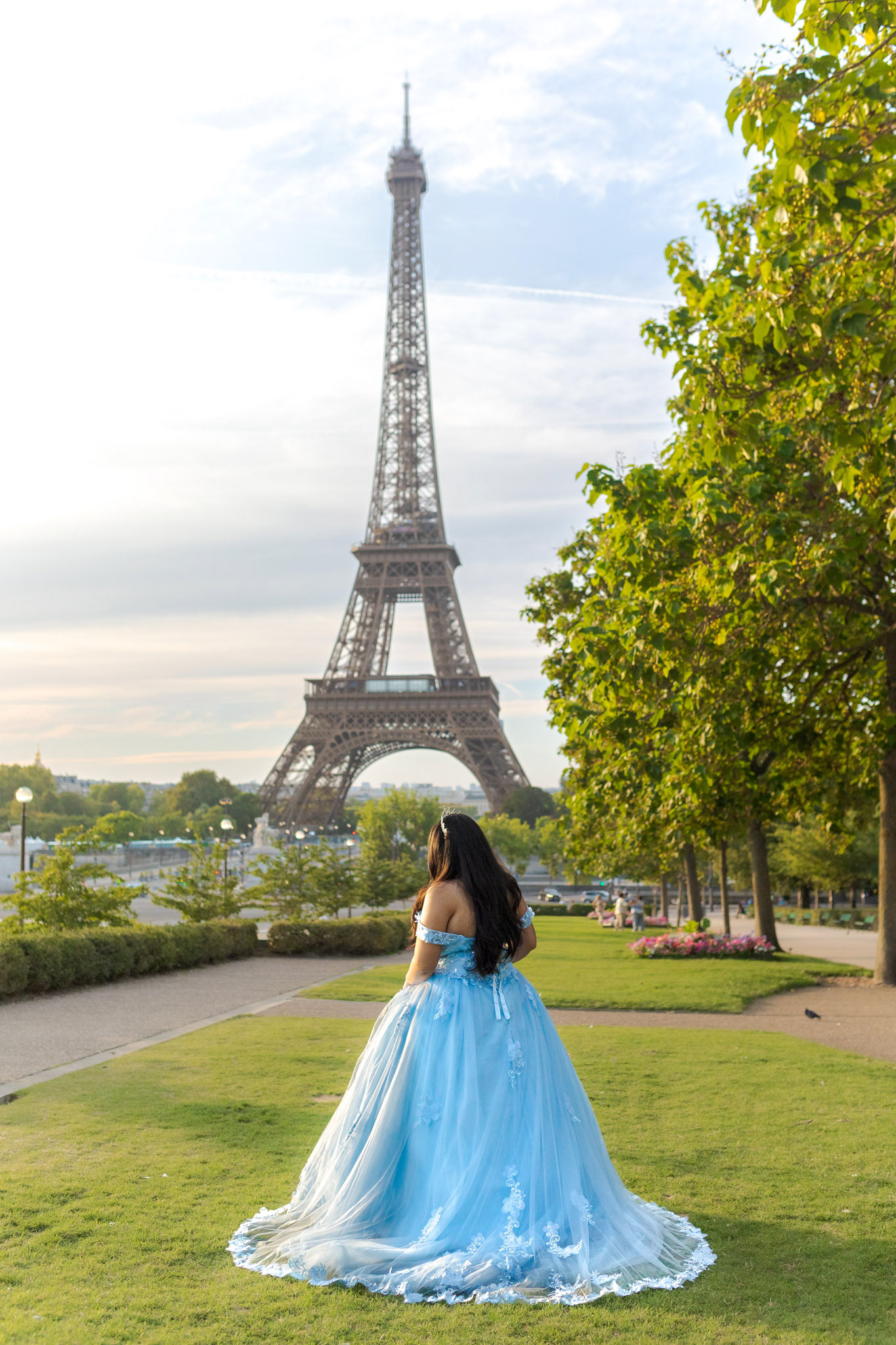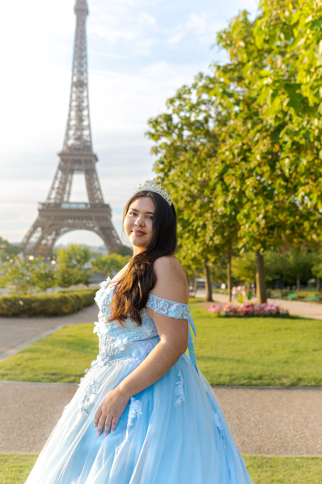 Kamila traveled all the way from Miami to Paris to fulfill her dream of a quinceañera photoshoot in the heart of the city. Wearing her beautiful, voluminous dress, she arrived at the Plaza de Trocadéro, the most iconic spot for photos with the Eiffel Tower in the background.
